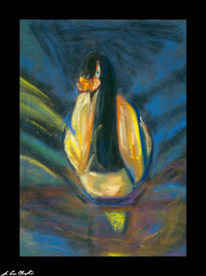 Description: This is a waterfowl pastel painting entitled The Swan. It is a portrait of a swan gliding across a lake. |